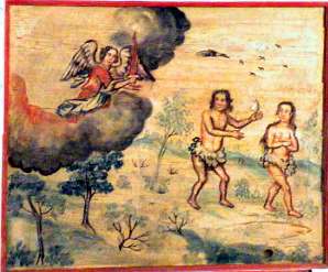 Und Gott der Herr trieb Adam aus, und lagerte vor dem Garten Eden den Cherubim mit einem bloßen hauendem Schwerd, zu bewahren den Weg zu dem Baume des Lebens(1. Mose 3, 24).